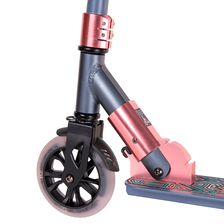 Эта модель от российского бренда Tech Team идеально подойдет для детей от 6 лет. На самокате установлены колеса диаметром 145 мм, которые обеспечивают хорошую маневренность и накат. А современная система складывания обеспечит удобную транспортировку и хранение самоката. Отличный вариант по соотношению цены и качества.
