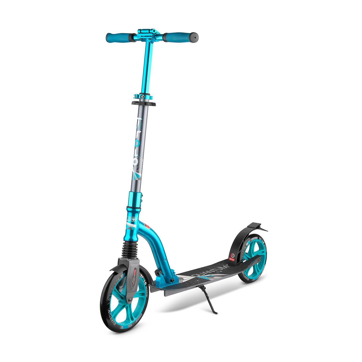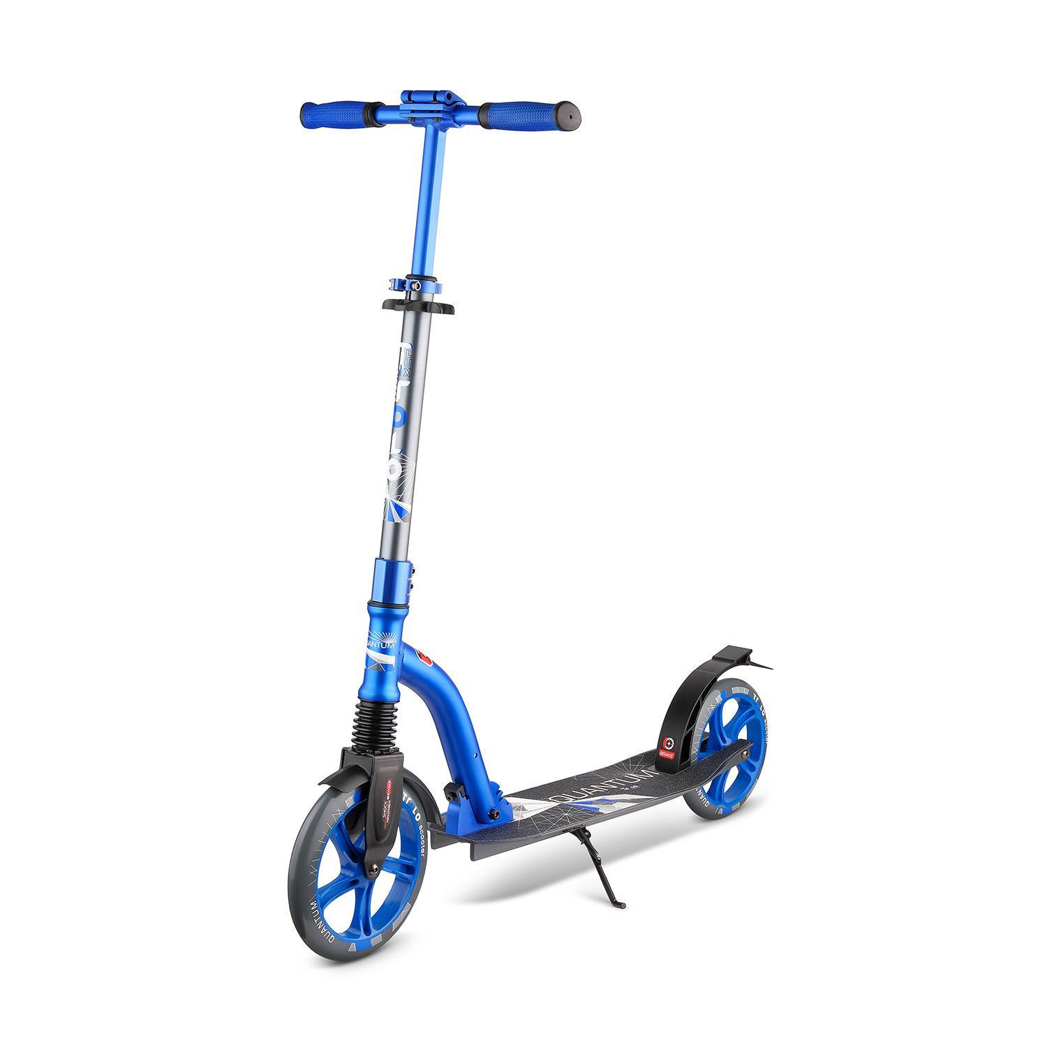 На самокат установлены большие колеса: переднее 230 мм, заднее 200 мм, что обеспечивает хороший накат, облегчает набор скорости, увеличивает максимальную скорость и экономит ваши силы.