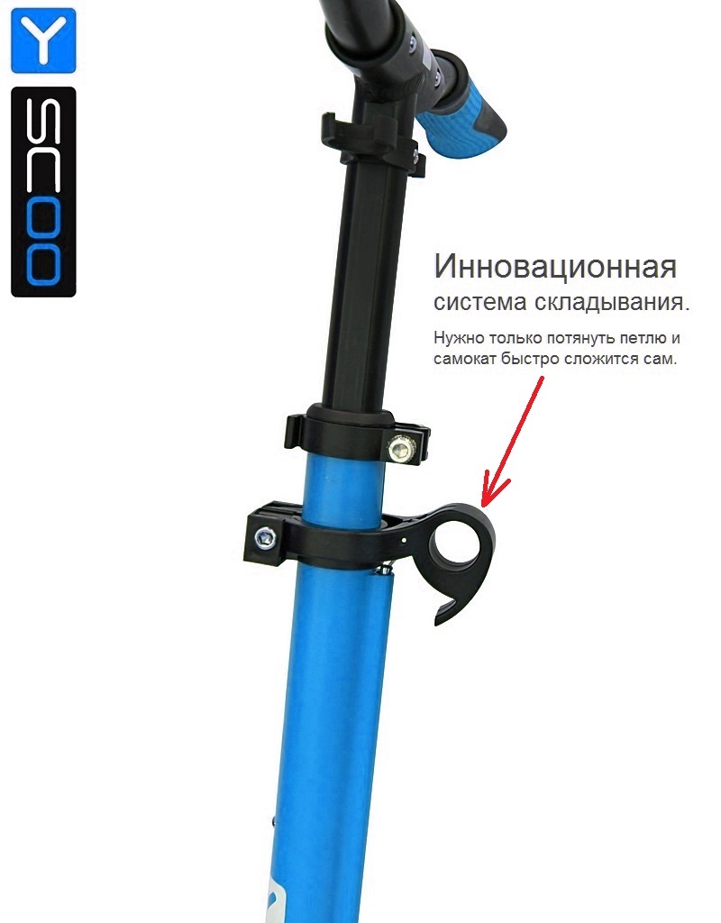 Интересная новинка на рынке. Y-SCOO ONE&ONE 215. Самокат оснащен полиуретановыми колесами диаметром 215-мм. Рулевой механизм с фиксатором не дает вращаться самокату вокруг своей оси. Удобный складной механизм позволяет сложиь самокат не нагибаясь! В комплекте идет сменная наждачная поверхность.
