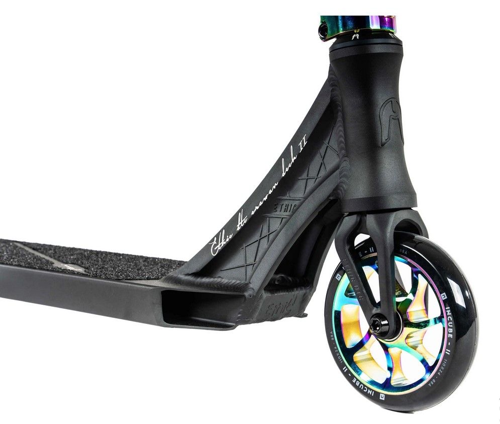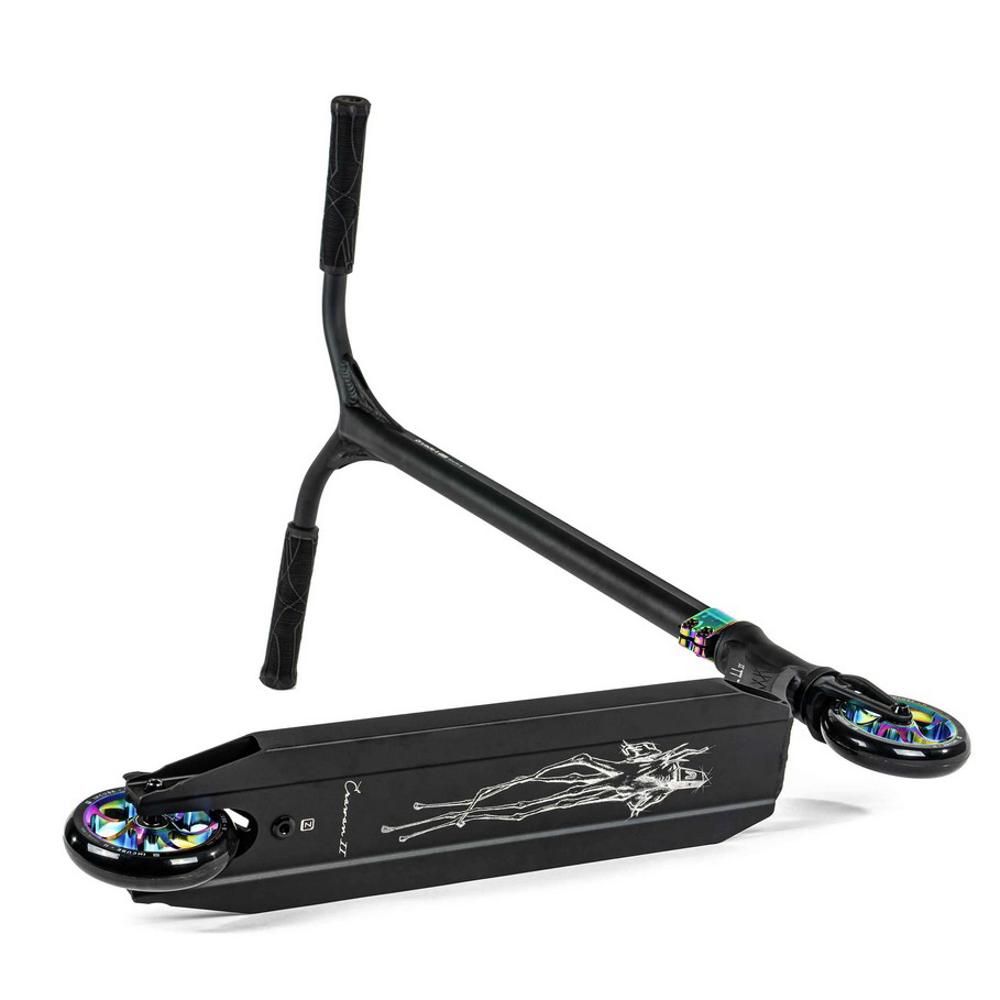 Обновленный самокат французского бренда крайне легкий при своих надежных комплектующих, которые можно приобрести и отдельно. Модель оборудована легким алюминиевым рулем Dryade V2, вилкой Ethic Legion V2, которая славится своей прочностью и надежностью, простой в обслуживании компрессии IHC, новой декой Erewan V2, а также стоят новые грипсы Ethic Slim с интегрированными барендами. Он точно станет новым любимцем профессиональных райдеров. Доступен теперь в двух размерах S и M.