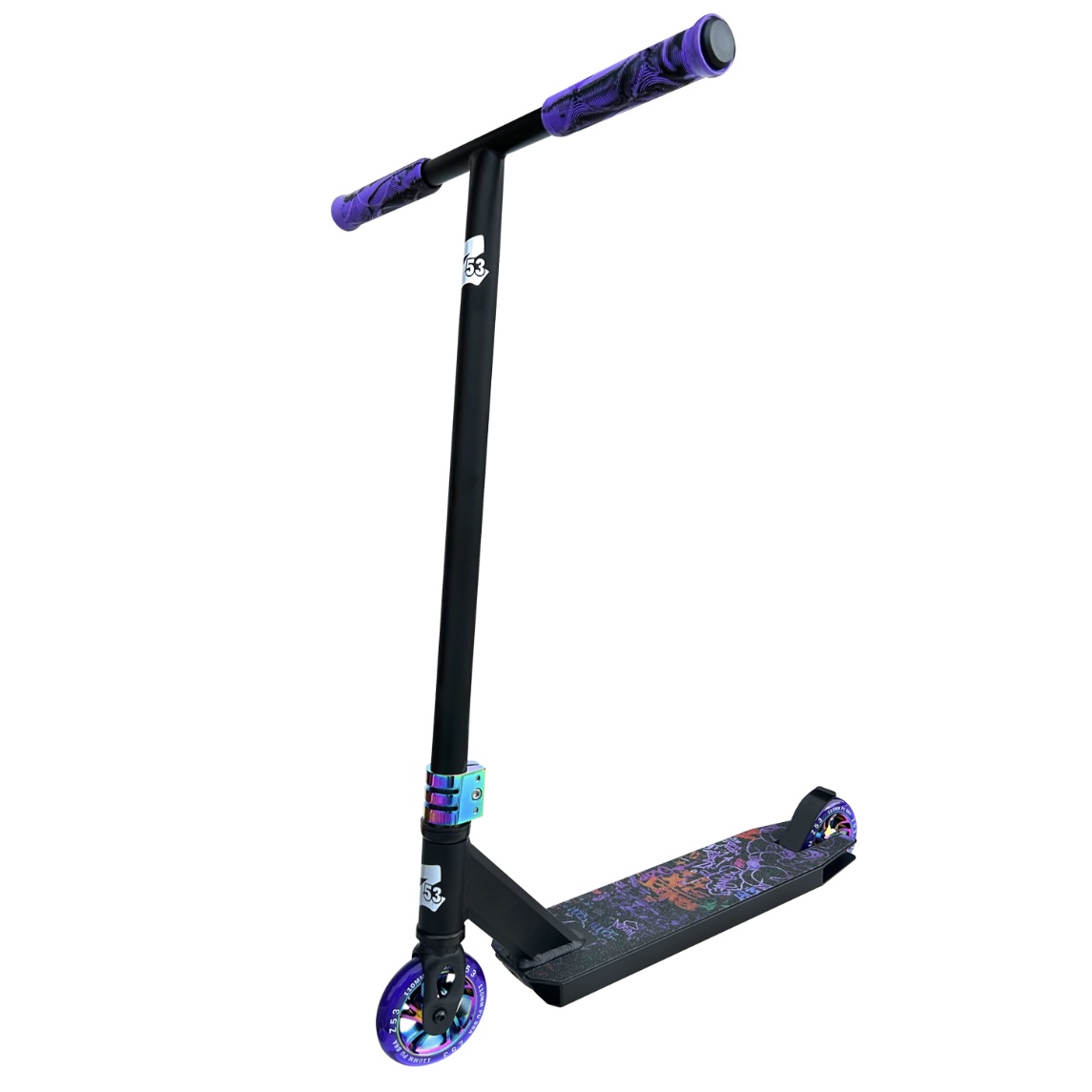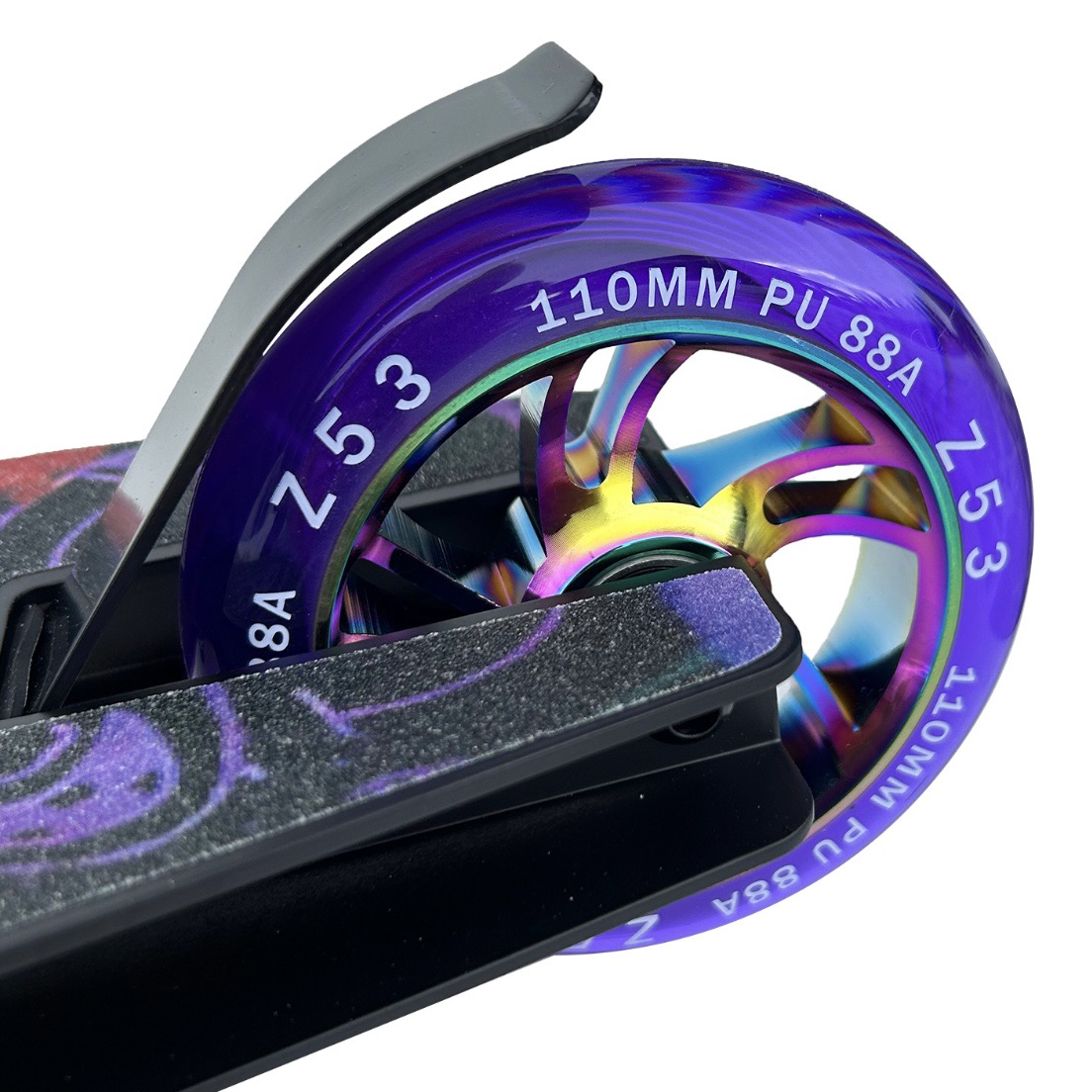 Один из самых лучших трюковых самокатов для новичков на сегодняшний день! Z53 уже давно на самокатном рынке и их главная особенность в том, что они делают действительно качественные трюковые самокаты и по очень доступной цене. На Z53 Predator 2 Purple установлена надежная система IHIC,которая подкручивается стандартным шестигранником и крепкий руль из хромомоблибденовой стали. Модель весит всего 3,6 кг, что отлично подойдет для изучения базовых трюков, ведь чем легче самокат, тем проще изучать различные трюковые элементы. А качественные полиуретановые колеса 110 мм с алюминиевой ступицей обеспечат маневренность и мягкость при катании. На самокате установлена крепкая алюминиевая дека(размер 48 см в длину и 11,6 см в ширину). Высота руля - 60 см и ширина- 50 см. А высота руля от пола составляет 82 см, и это значит, что самокат отлично подойдет для ребят с ростом от 135 до 160 см.
