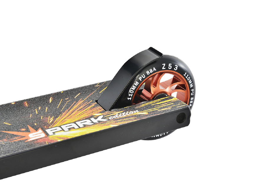 Модель с Y-образным рулем из хроммолибденовой стали, дека с квадратными дропаутами для удобного скольжения по граням, рулевая интегрированная, вилка алюминиевая монолитная, колеса 110 мм с алюминиевой ступицей, система компрессии HIC.