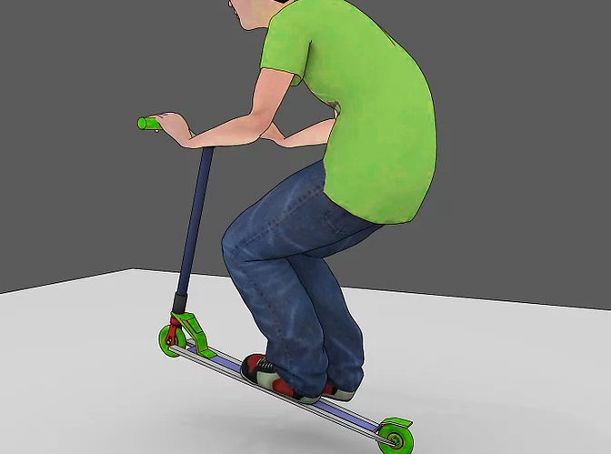 1. Стань удобно на самокат. Передняя нога ближе к рулю под углом 45 градусов. Задняя, когда ей не отталкиваешься, тоже стоит на деке за передней. На переднюю ногу приходится основной вес тела. Мы говорили об этом в разделе Стойка на трюковом самокате.